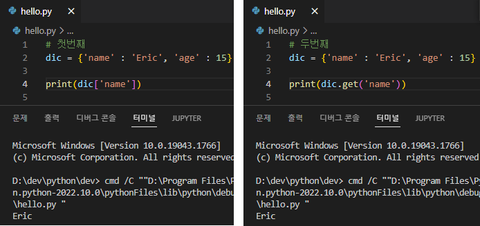 딕셔너리 Key를 이용한 Value 구하는 방법 차이Python/기초 강의 2022. 7. 16. 01:01