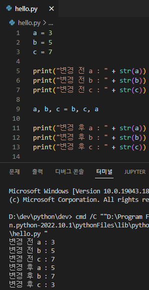 변수 a에 b값을 넣고 b에 c값을 넣고 c에 a값을 넣는법