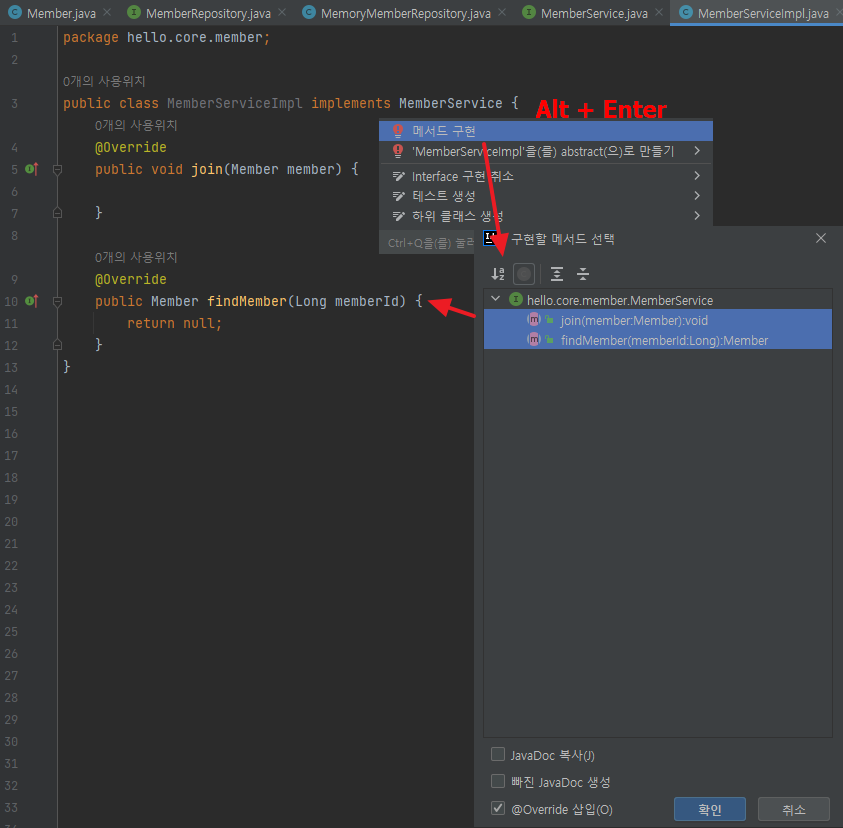 main/java/hello.core/member/MemberServiceImpl 생성