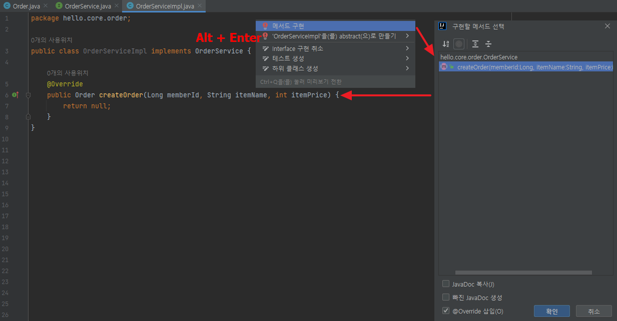 main/java/hello.core/order/OrderServiceImpl 생성