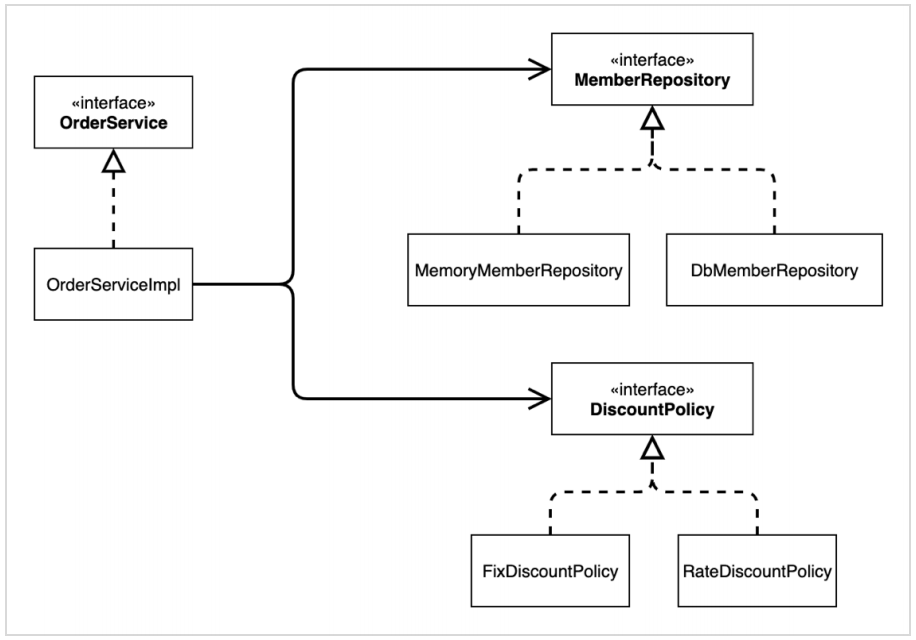 - OrderServiceImpl은 MemberRepository, DiscountPolicy에 의존한다는 것을 알 수 있다. 그런데 이러한 클래스 의존관계 만으로는 실제 어떤 객체가 OrderServiceImpl에 주입 될지 알 수 없다.