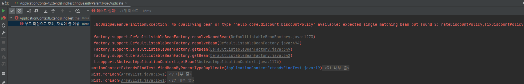 assertThrows(NoUniqueBeanDefinitionException.class, () -> ac.getBean(DiscountPolicy.class));