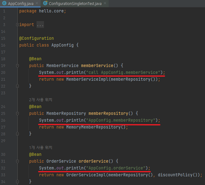 - AppConfig의 자바 코드를 보면 분명히 각각 2번 new MemoryMemberRepository 호출해서 다른 인스턴스가 생성되어야 하는데?