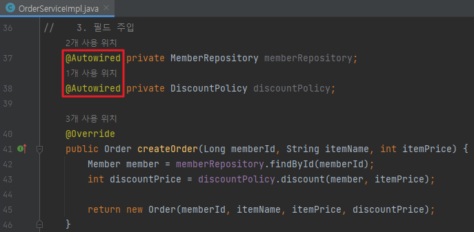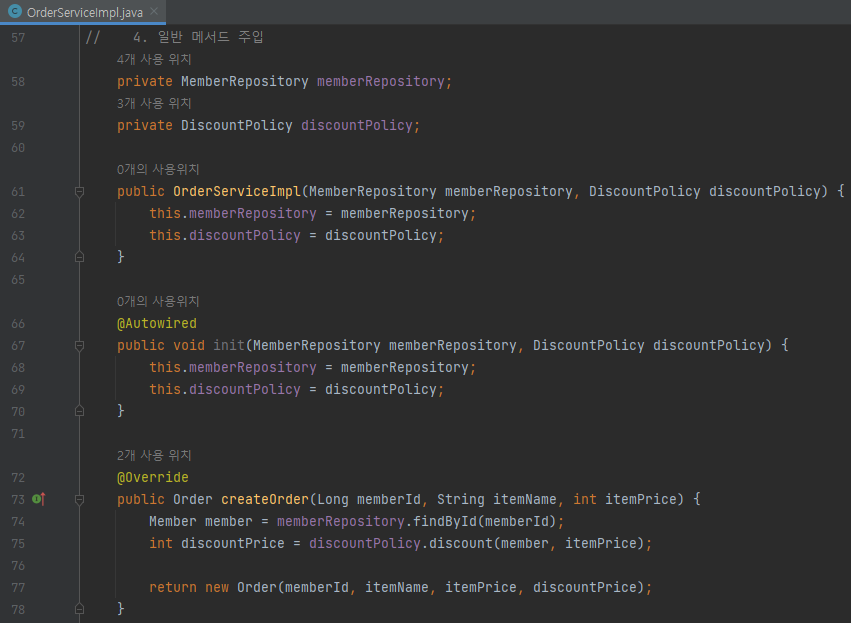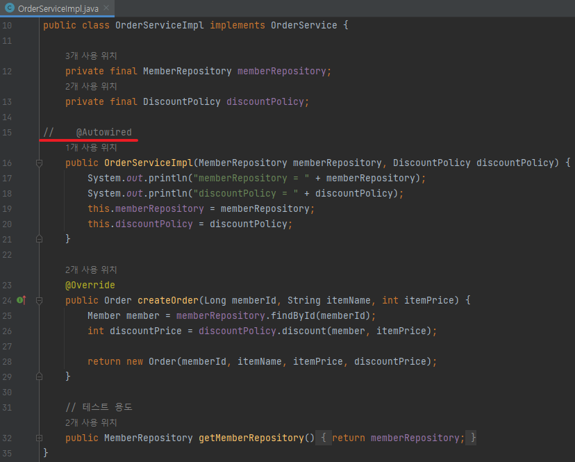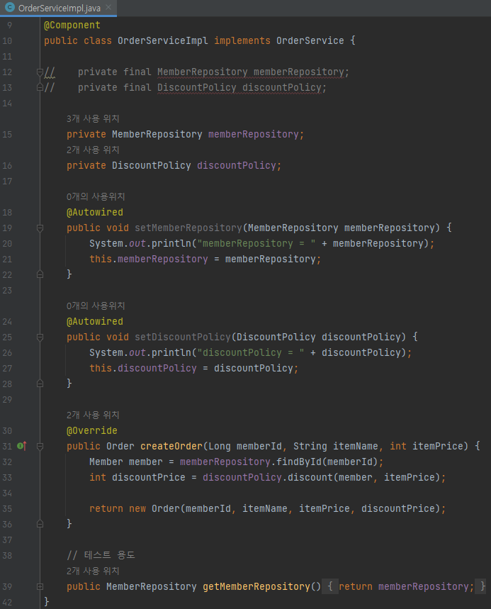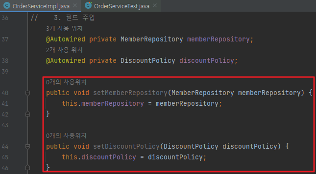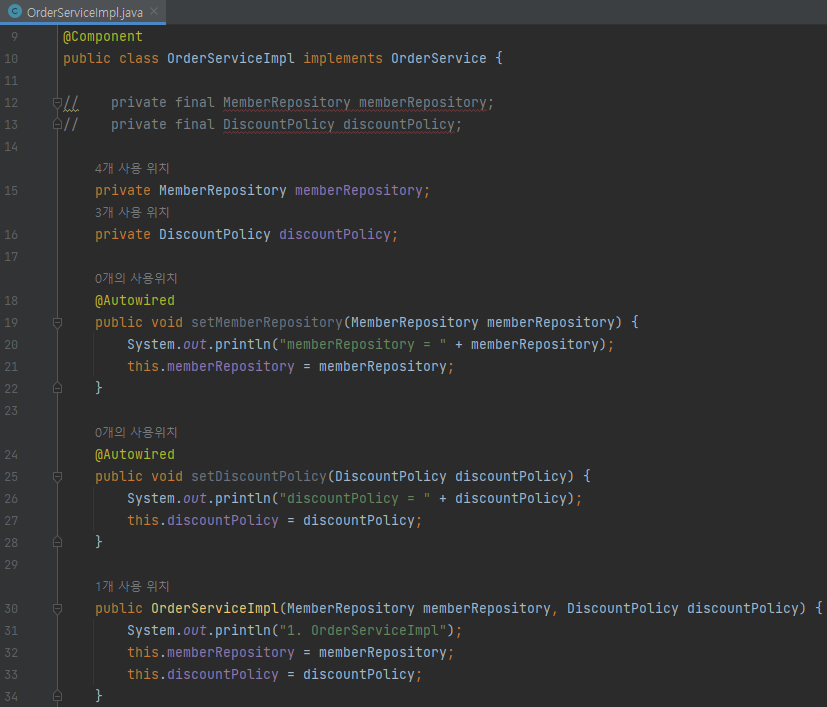 생성자의 memberRepository, discountPolicy는 set의 memberRepository, discountPolicy와 같기 때문에 생성자 생략 가능