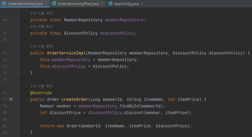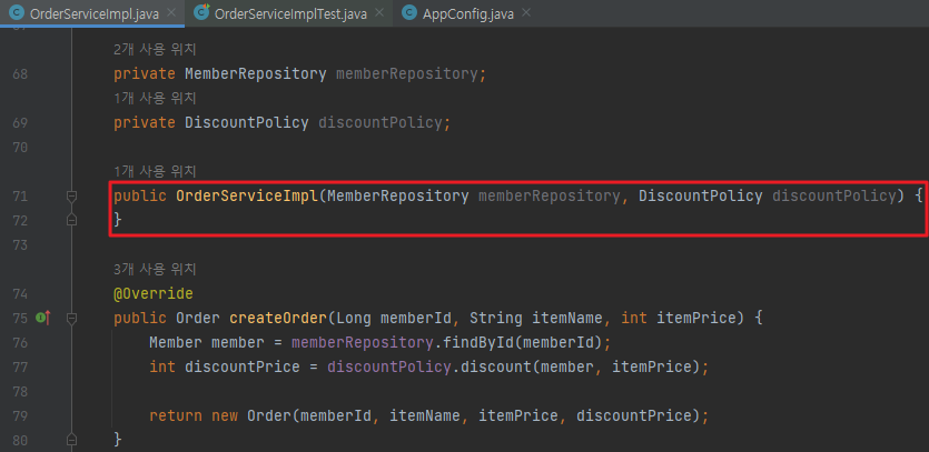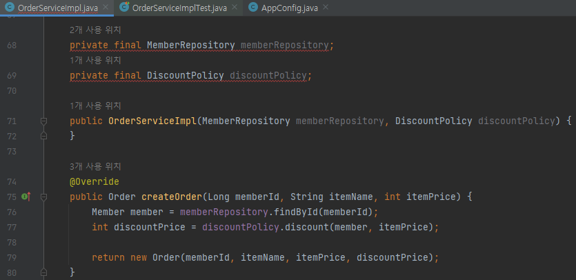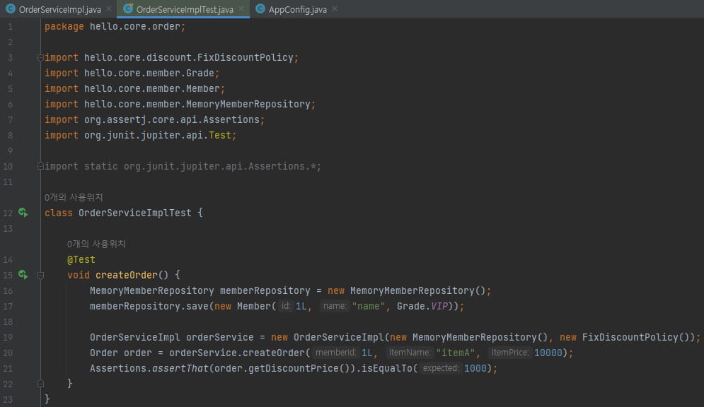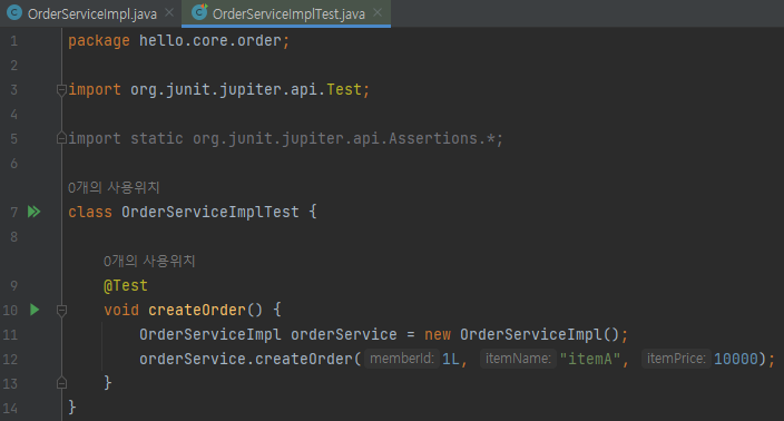 OrderServiceImpl orderService = new OrderServiceImpl(new MemoryMemberRepository(), new FixDiscountPolicy());