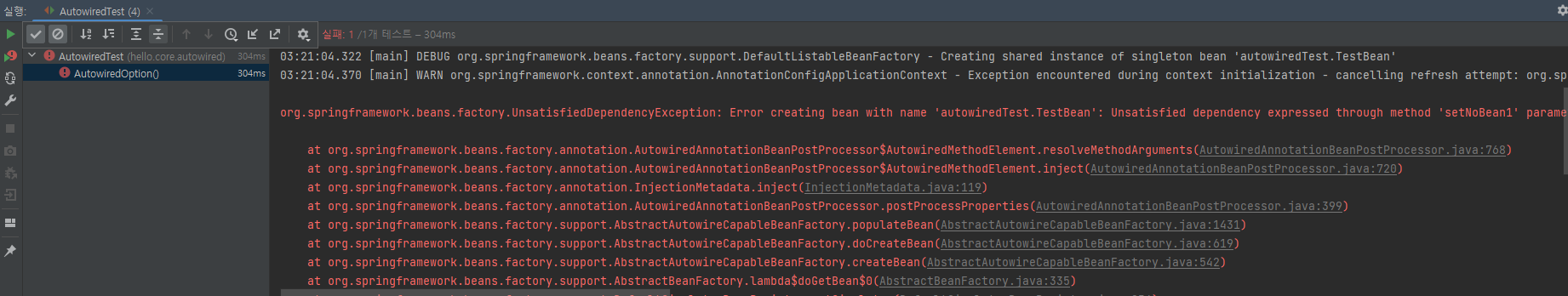 그런데 @Autowired만 사용하면 required 옵션의 기본값이 true로 되어 있어서 자동 주입 대상이 없으면 오류가 발생한다.