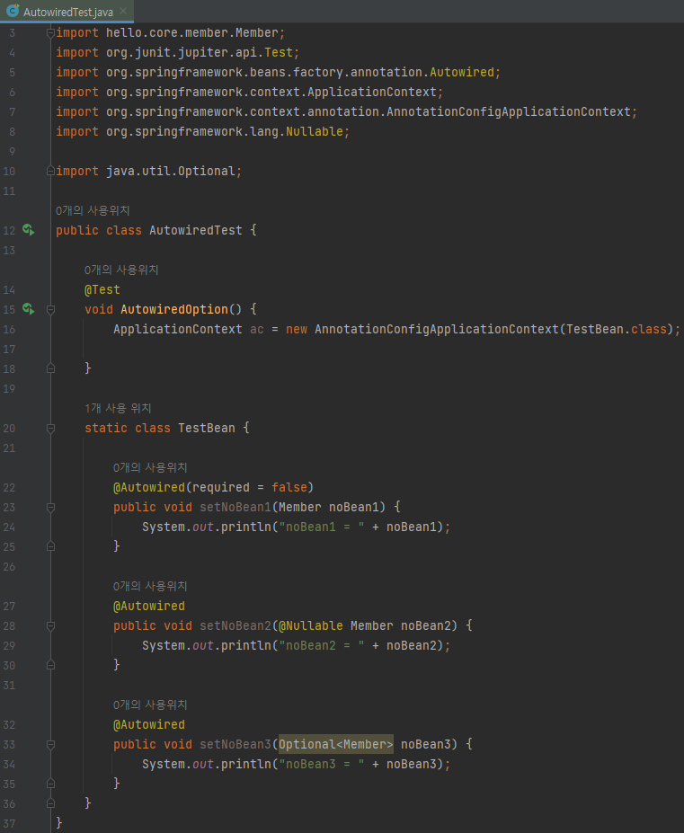 - org.springframework.lang.@Nullable : 자동 주입할 대상이 없으면 null이 입력된다.
