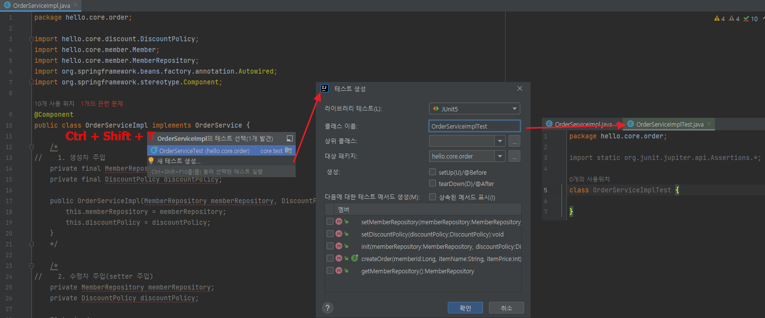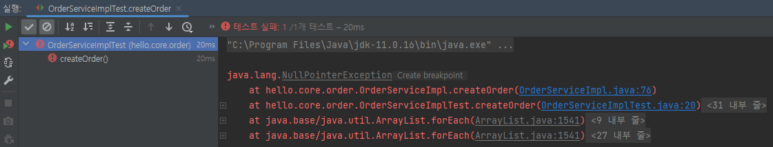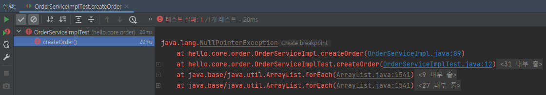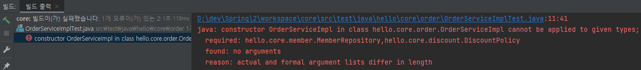 OrderServiceImpl, OrderServiceImplTest 코드 상에서는 문제없지만 실행하면 에러 발생