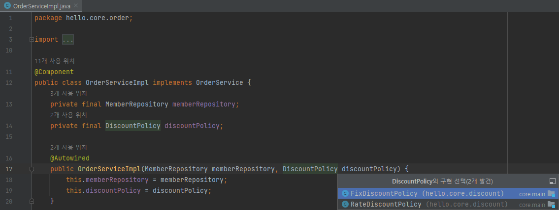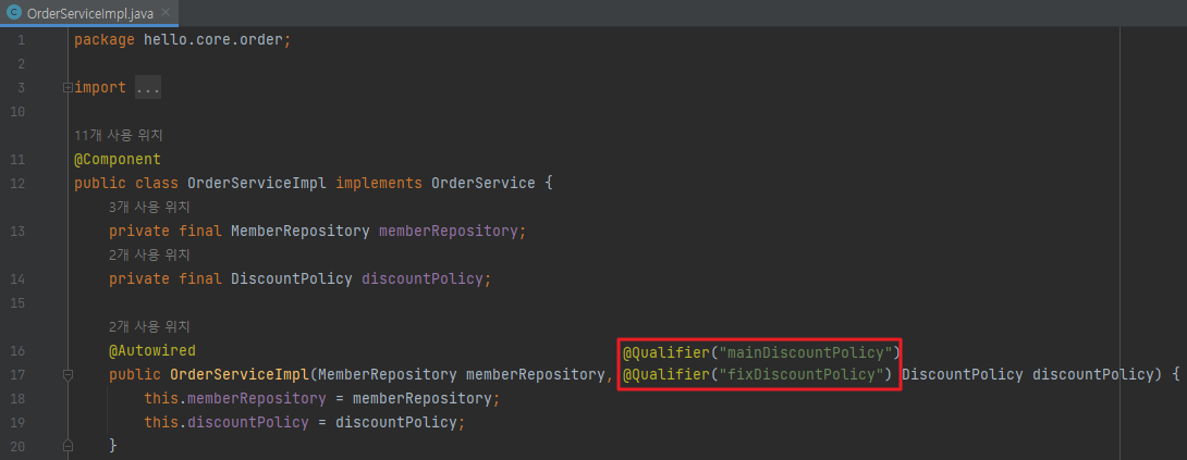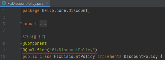 @Qualifier("mainDiscountPolicy") 혹은 @Qualifier("fixDiscountPolicy") 추가