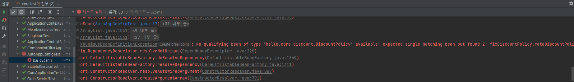 하나의 빈을 기대했는데 fixDiscountPolicy , rateDiscountPolicy 2개가 발견되었다고 알려줌