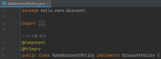 DiscountPolicy에 여러 대상이 있지만 RateDiscountPolicy에 있는 @Primary 때문에 최우선 순위로 선택