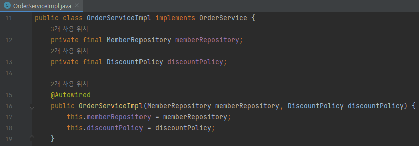 private DiscountPolicy discountPolicy타입으로 조회하기 때문에, 마치 다음 코드와 유사하게 동작한다. (실제로는 더 많은 기능을 제공한다.)