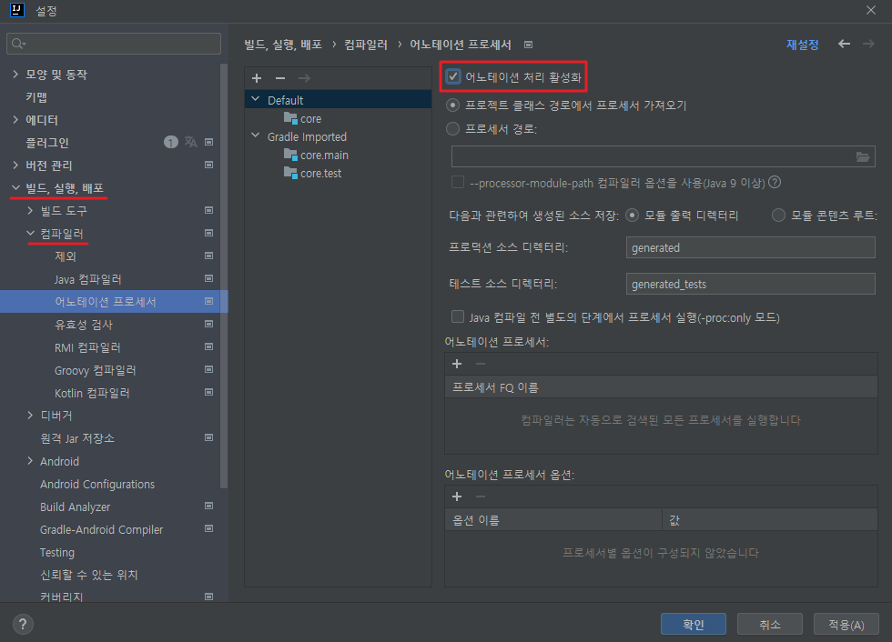 설정 > 빌드, 실행, 배포 > 컴파일러 > 어노테이션 프로세서 > '어노테이션 처리 활성화' 체크 > 적용 > 확인