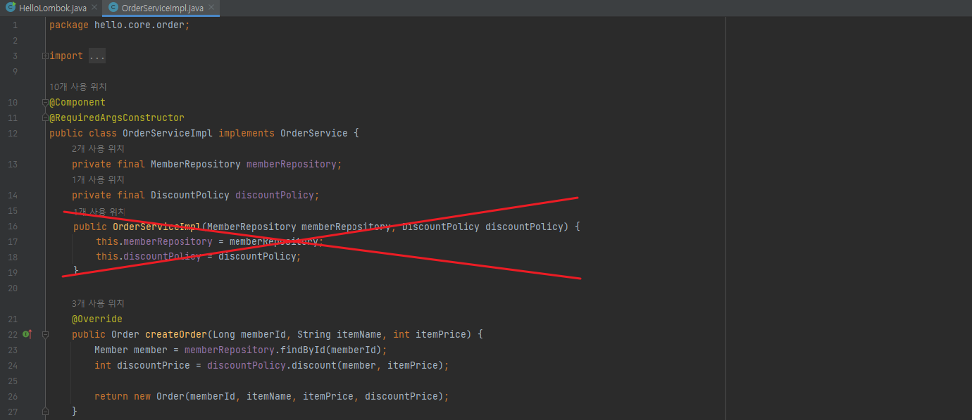 최근에는 생성자를 딱 1개 두고, @Autowired를 생략하는 방법을 주로 사용한다. 여기에 Lombok 라이브러리의 @RequiredArgsConstructor를 함께 사용하면 기능은 다 제공하면서, 코드는 깔끔하게 사용할 수 있다