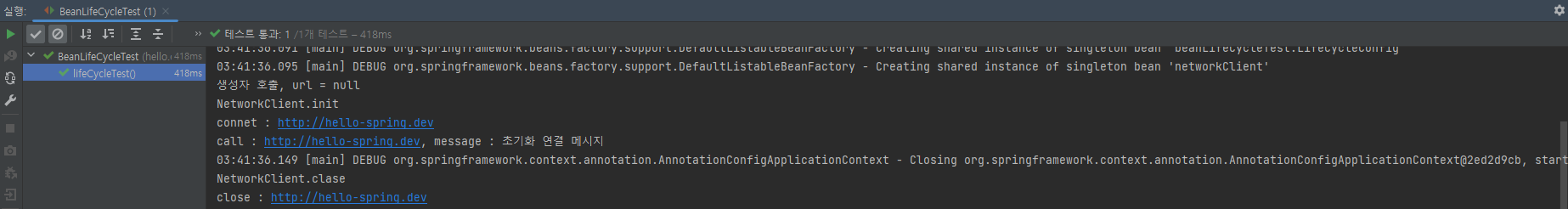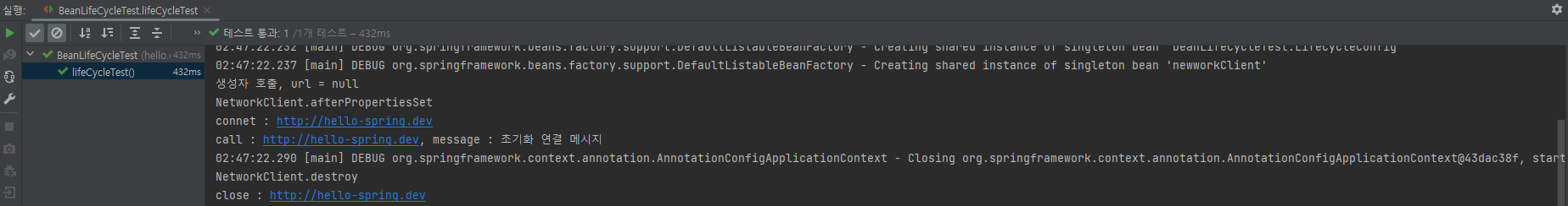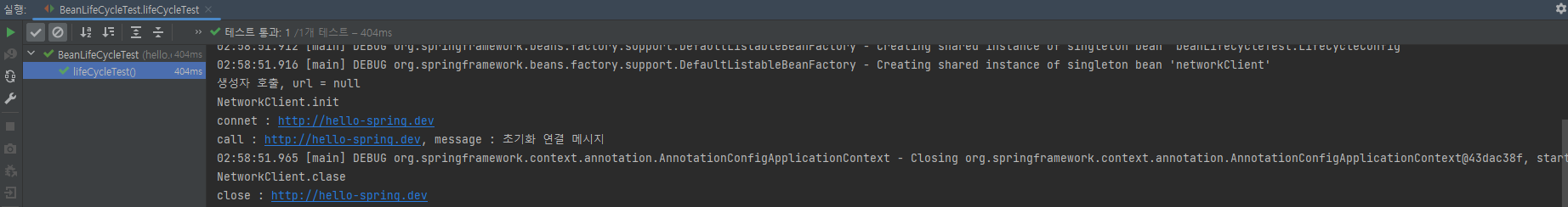 - 그리고 스프링 컨테이너의 종료가 호출되자 소멸 메서드가 호출된 것도 확인할 수 있다.