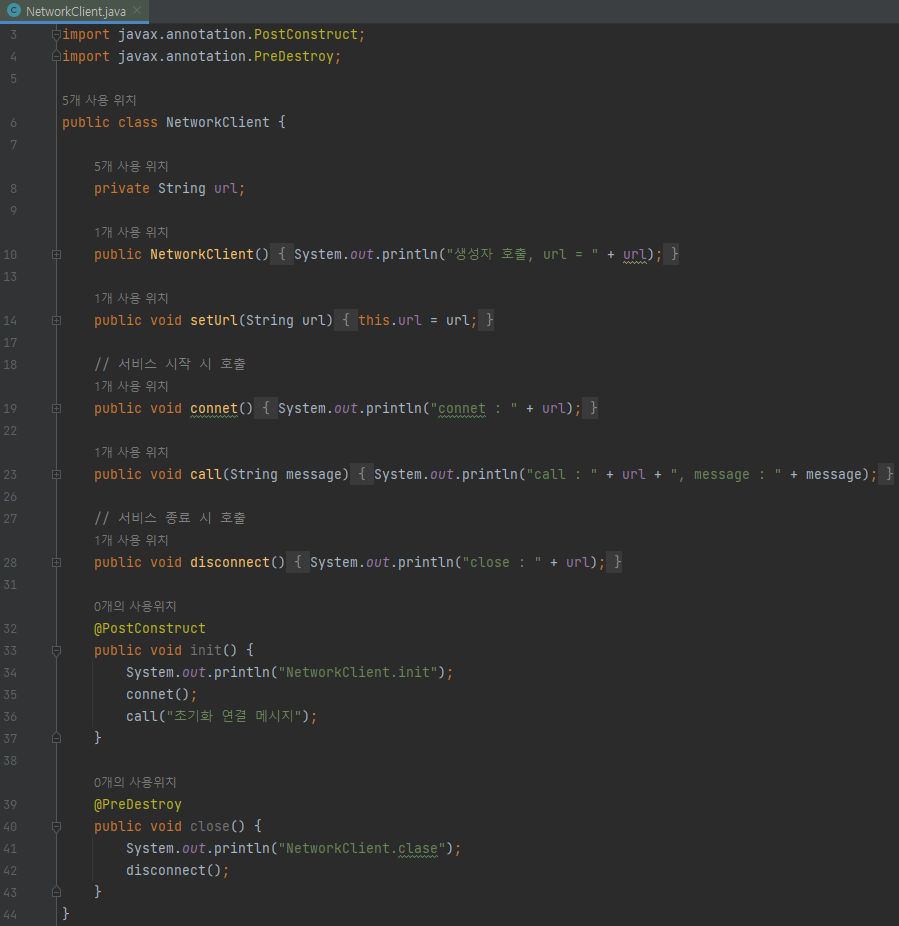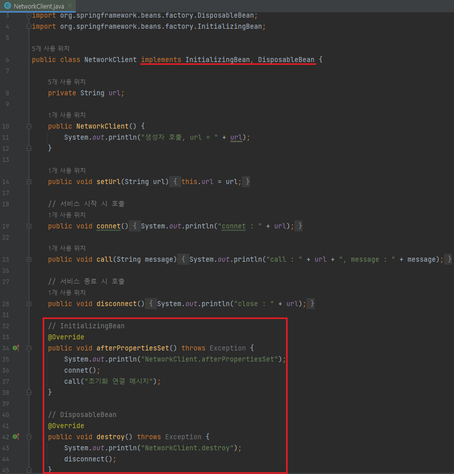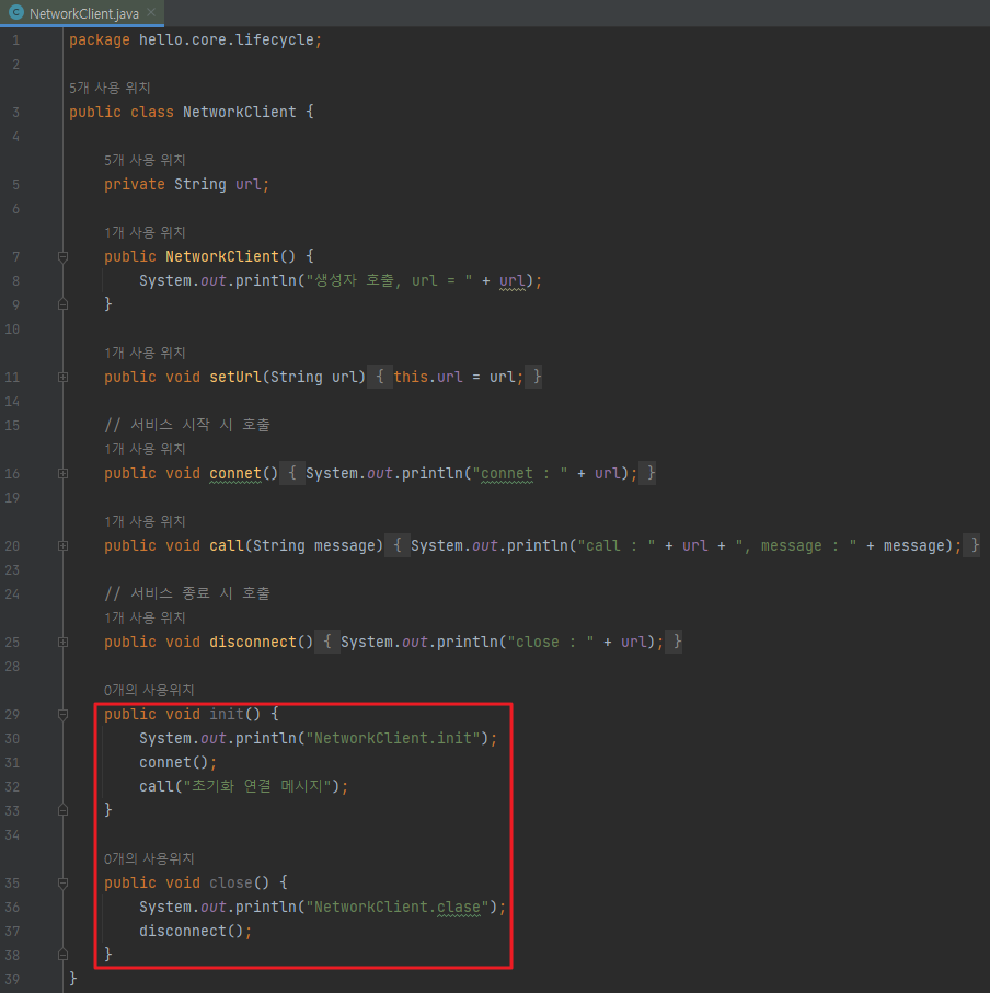 참고 : 인터페이스를 사용하는 초기화, 종료 방법은 스프링 초창기에 나온 방법들이고, 지금은 다음의 더