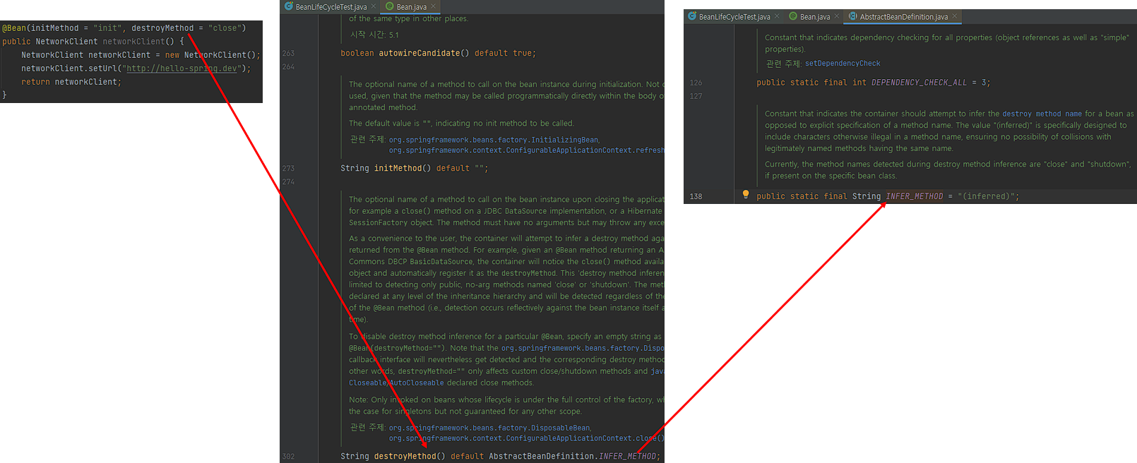 - @Bean의 destroyMethod는 기본값이 (inferred) (추론)으로 등록되어 있다.
