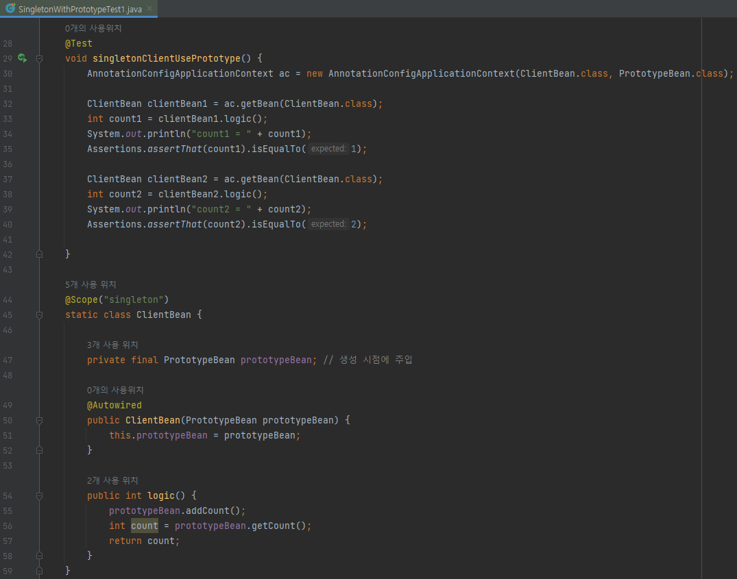 Assertions.assertThat(prototypeBean2.getCount()).isEqualTo(1);