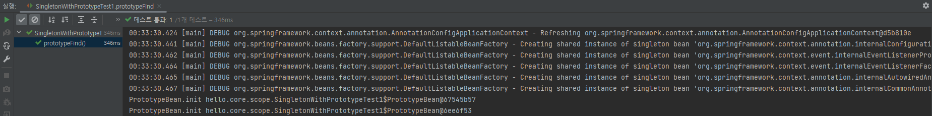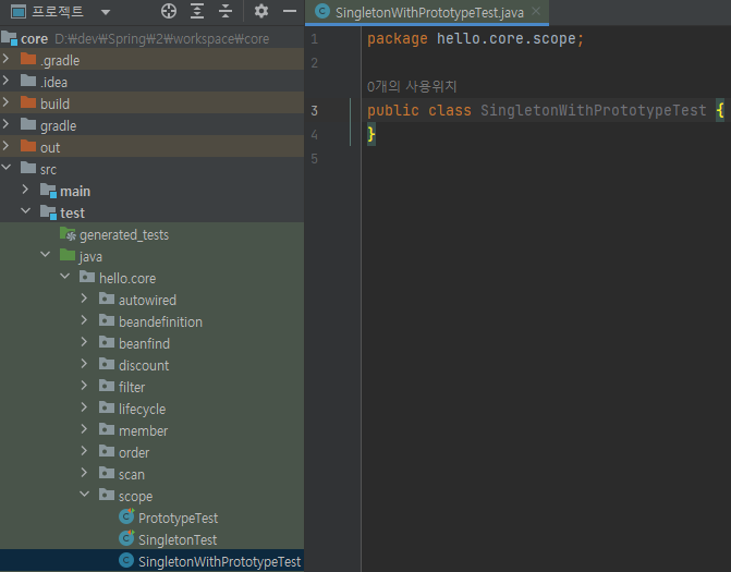 test/java/hello.core/scope/SingletonWithPrototypeTest 생성