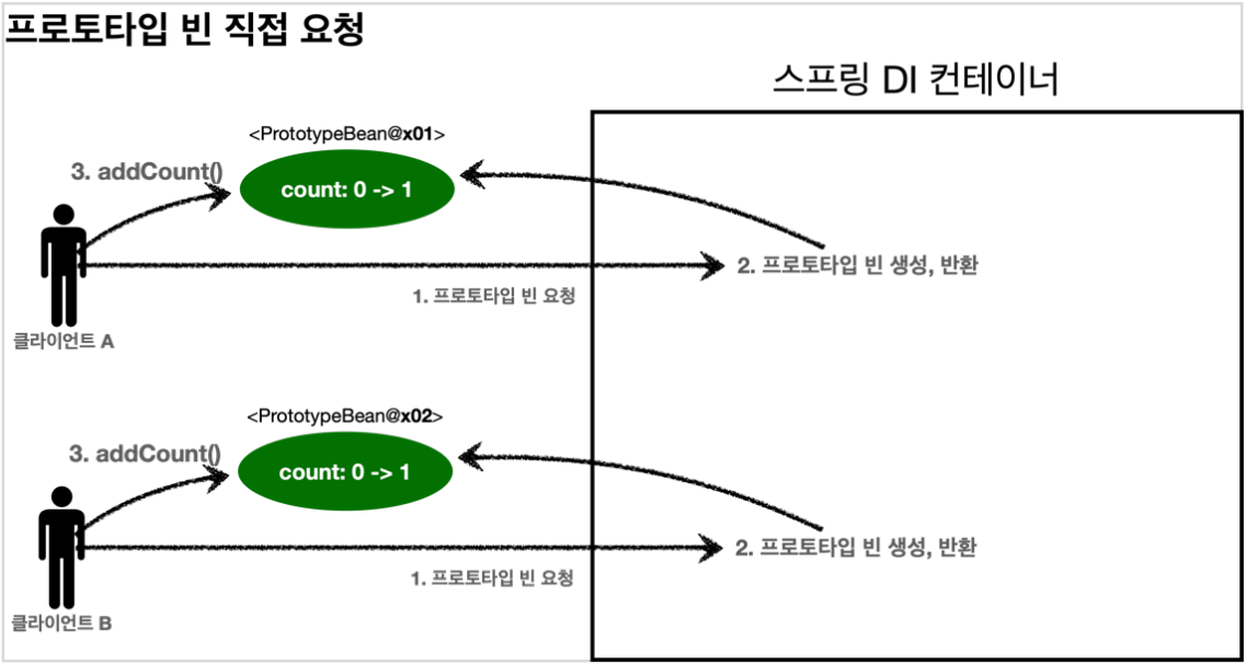 - 1. 클라이언트B는 스프링 컨테이너에 프로토타입 빈을 요청한다.