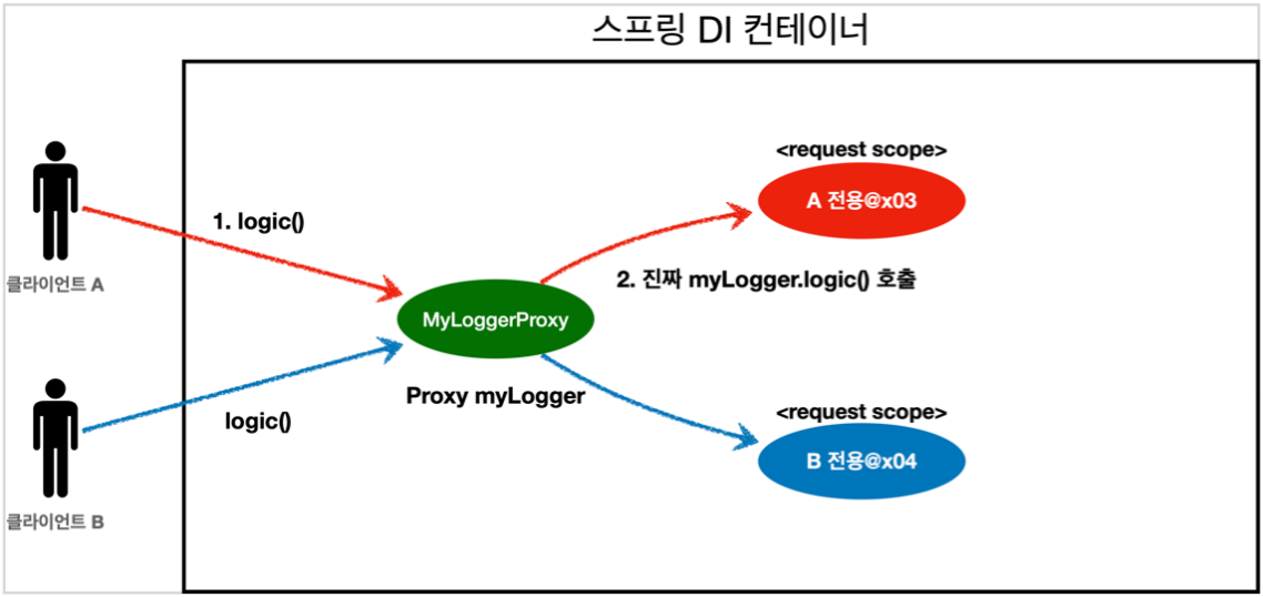 - 이렇게 하면 MyLogger의 가짜 프록시 클래스를 만들어두고 HTTP request와 상관없이 가짜 프록시클래스를 다른 빈에 미리 주입해 둘 수 있다.