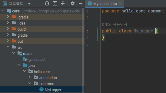 의존관계 주입이 발생하면 스프링 컨테이너한테 MyLogger를 요청하는데 문제가 있음