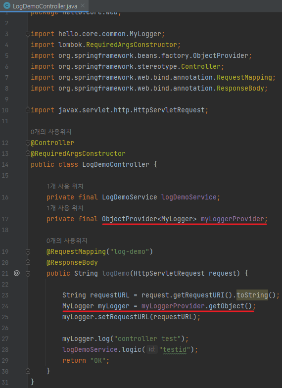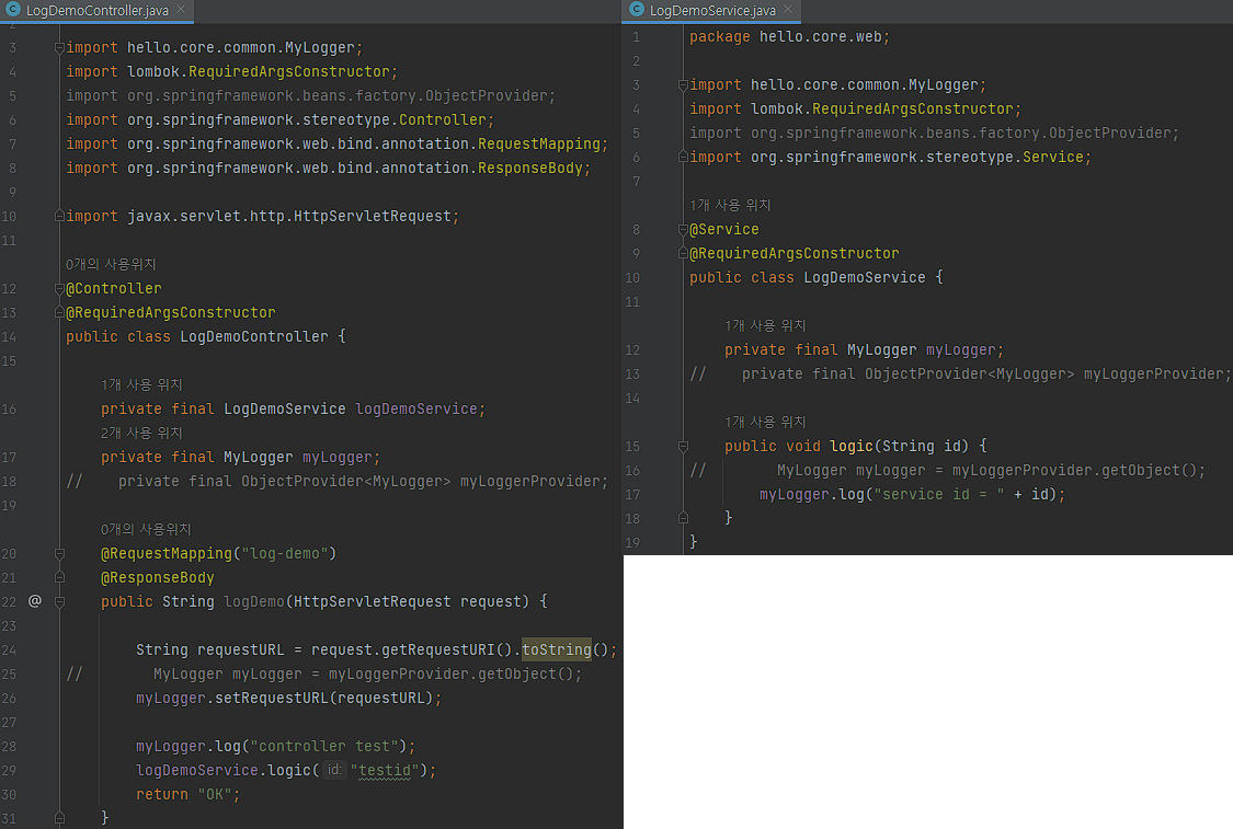 - ObjectProvider.getObject()를 LogDemoController, LogDemoService에서 각각 한 번씩 따로 호출해도 같은 HTTP 요청이면 같은 스프링 빈이 반환된다!