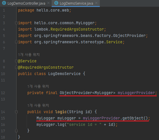 private final ObjectProvider<MyLogger> myLoggerProvider;