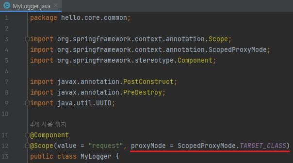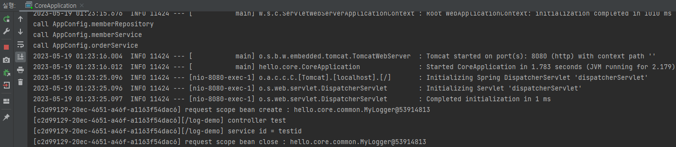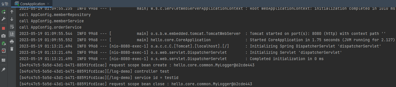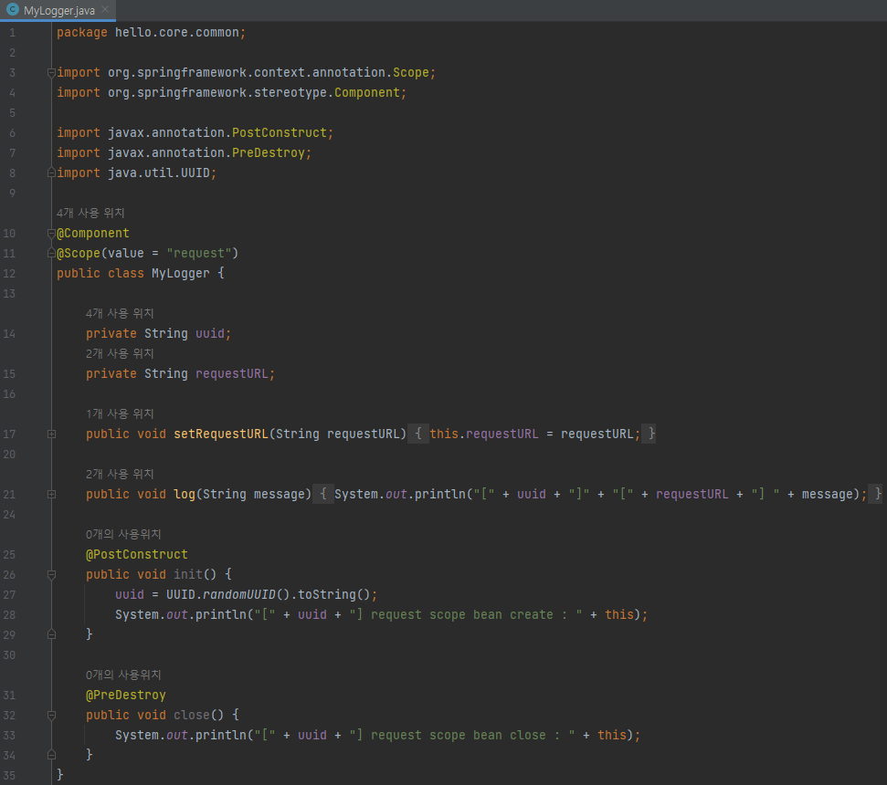- 이 빈이 생성되는 시점에 자동으로 @PostConstruct 초기화 메서드를 사용해서 uuid를 생성해서 저장해 둔다. 이 빈은 HTTP 요청 당 하나씩 생성되므로, uuid를 저장해 두면 다른 HTTP 요청과 구분할 수 있다.
