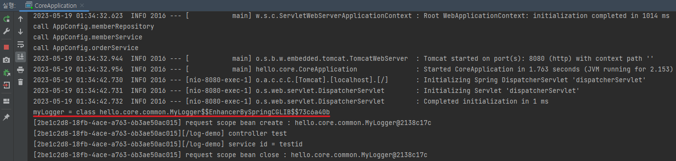 - 결과를 확인해 보면 우리가 등록한 순수한 MyLogger 클래스가 아니라 MyLogger$$EnhancerBySpringCGLIB 이라는 클래스로 만들어진 객체가 대신 등록된 것을 확인할 수 있다.