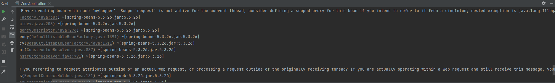 MyLogger 생존 범위는 http request가 들어와서 나갈 때 까진데 스프링 컨테이너가 뜨는 시점에 http request가 없어서 에러 발생