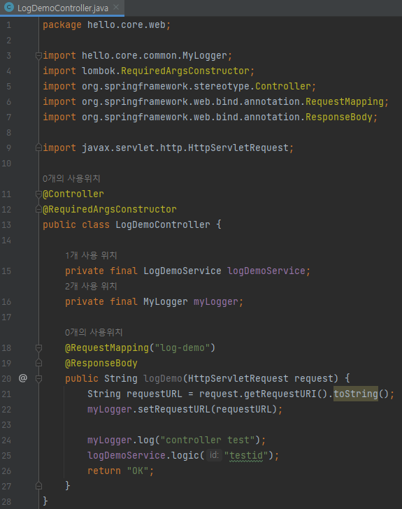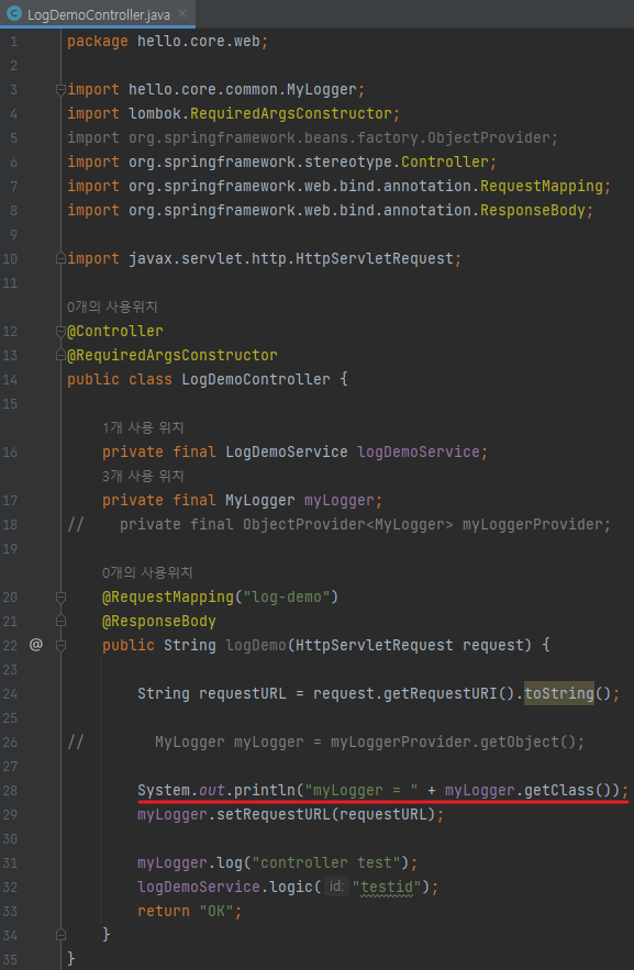 ※ 참고 : requestURL을 MyLogger에 저장하는 부분은 컨트롤러보다는 공통 처리가 가능한 스프링 인터셉터나 서블릿 필터 같은 곳을 활용하는 것이 좋다. 여기서는 예제를 단순화하고, 아직 스프링 인터셉터를 학습하지 않은 분들을 위해서 컨트롤러를 사용했다. 스프링 웹에 익숙하다면 인터셉터를 사용해서 구현해 보자.