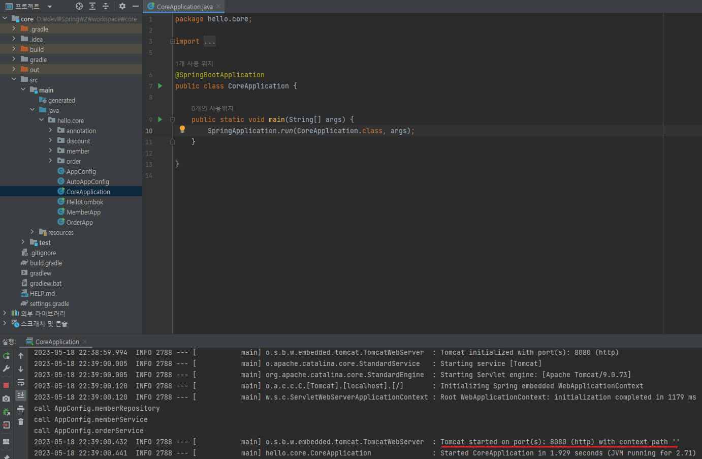 ※ 참고 : 스프링 부트는 웹 라이브러리가 없으면 우리가 지금까지 학습한 AnnotationConfigApplicationContext을 기반으로 애플리케이션을 구동한다. 웹 라이브러리가 추가되면 웹과 관련된 추가 설정과 환경들이 필요하므로 AnnotationConfigServletWebServerApplicationContext를 기반으로 애플리케이션을 구동한다.
