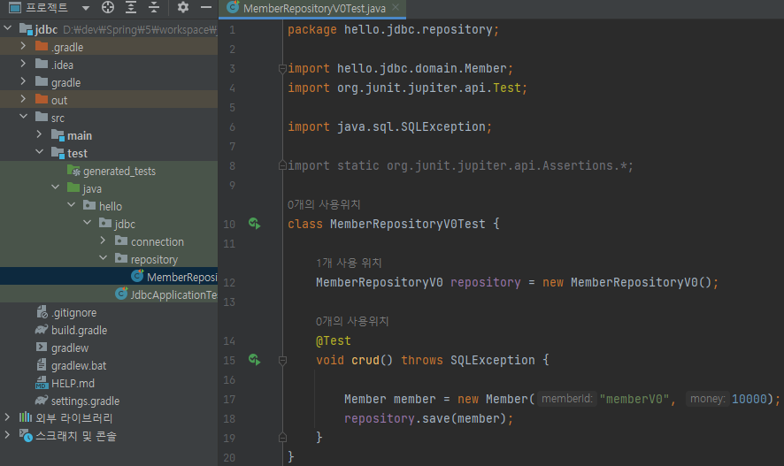 test/java/hello/jdbc/repository/MemberRepositoryV0Test 생성