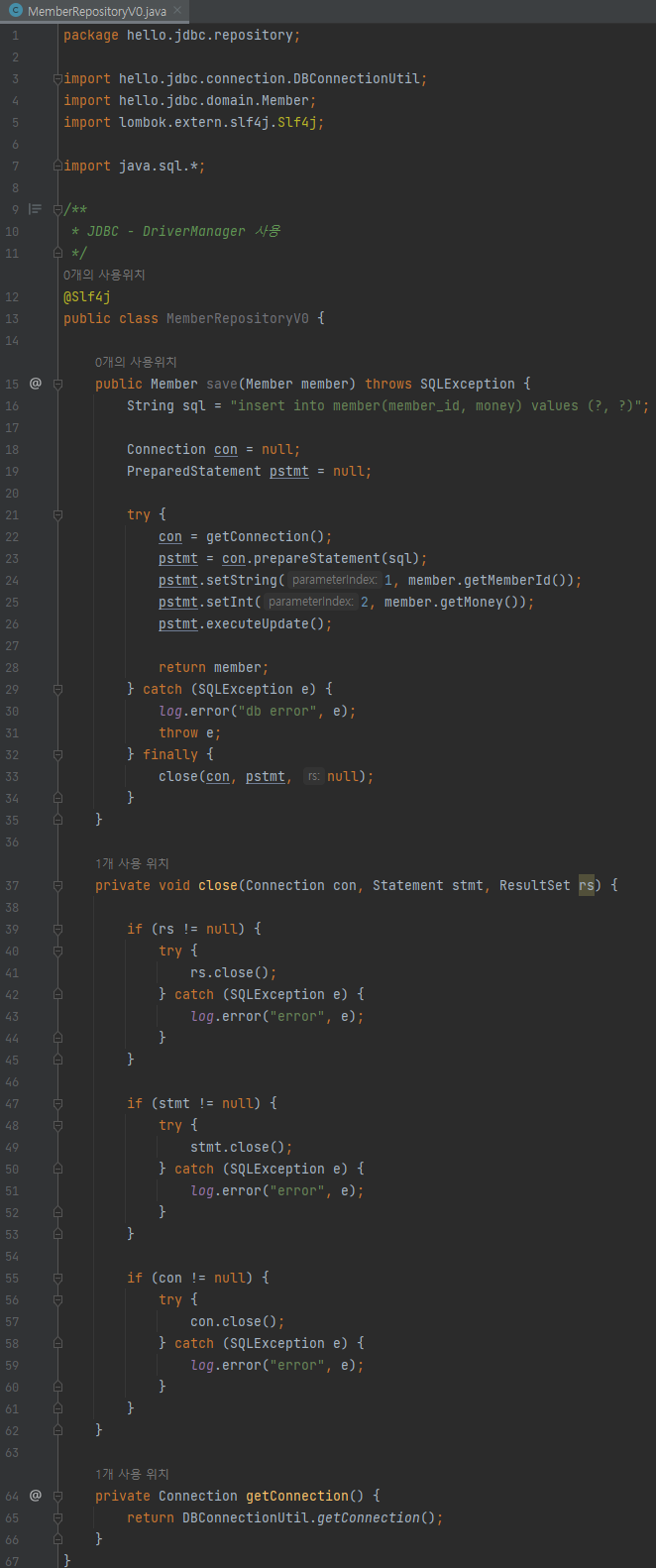 - getConnection() : 이전에 만들어둔 DBConnectionUtil를 통해서 데이터베이스 커넥션을 획득한다.