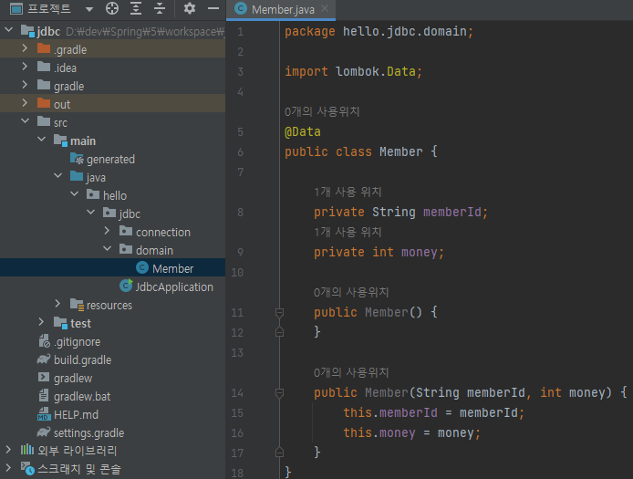 package hello.jdbc.domain; import lombok.Data; @Data public class Member { private String memberId; private int money; public Member() { } public Member(String memberId, int money) { this.memberId = memberId; this.money = money; } }