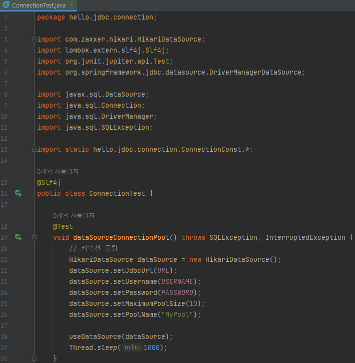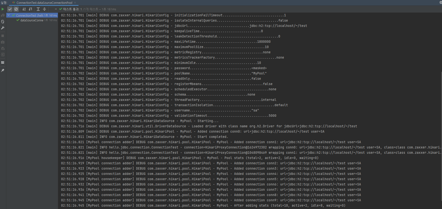 - 커넥션 풀에서 커넥션을 생성하는 작업은 애플리케이션 실행 속도에 영향을 주지 않기 위해 별도의 쓰레드에서 작동한다. 별도의 쓰레드에서 동작하기 때문에 테스트가 먼저 종료되어 버린다. 예제처럼 Thread.sleep을 통해 대기 시간을 주어야 쓰레드 풀에 커넥션이 생성되는 로그를 확인할 수 있다.