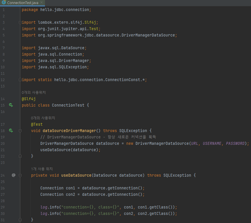 package hello.jdbc.connection; import lombok.extern.slf4j.Slf4j; import org.junit.jupiter.api.Test; import java.sql.Connection; import java.sql.DriverManager; import java.sql.SQLException; import static hello.jdbc.connection.ConnectionConst.*; @Slf4j public class ConnectionTest { @Test void driverManager() throws SQLException { Connection con1 = DriverManager.getConnection(URL, USERNAME, PASSWORD); Connection con2 = DriverManager.getConnection(URL, USERNAME, PASSWORD); log.info("connection={}, class={}", con1, con1.getClass()); log.info("connection={}, class={}", con2, con2.getClass()); } }