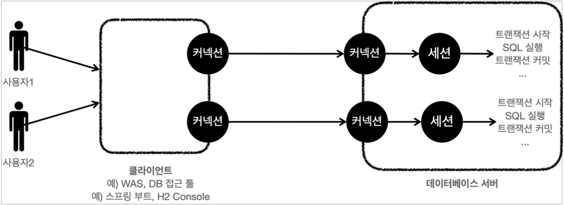 - 사용자는 웹 애플리케이션 서버(WAS)나 DB 접근 툴 같은 클라이언트를 사용해서 데이터베이스 서버에 접근할 수 있다. 클라이언트는 데이터베이스 서버에 연결을 요청하고 커넥션을 맺게 된다. 이때 데이터베이스 서버는 내부에 세션이라는 것을 만든다. 그리고 앞으로 해당 커넥션을 통한 모든 요청은 이 세션을 통해서 실행하게 된다.