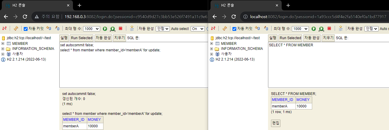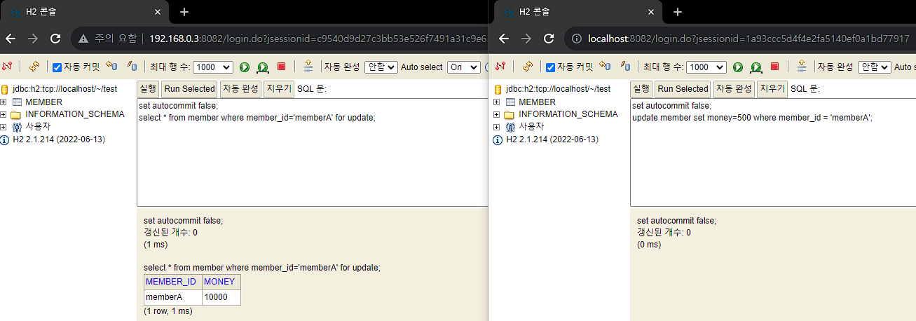 select * from member where member_id='memberA' for update;- select for update 구문을 사용하면 조회를 하면서 동시에 선택한 로우의 락도 획득한다.