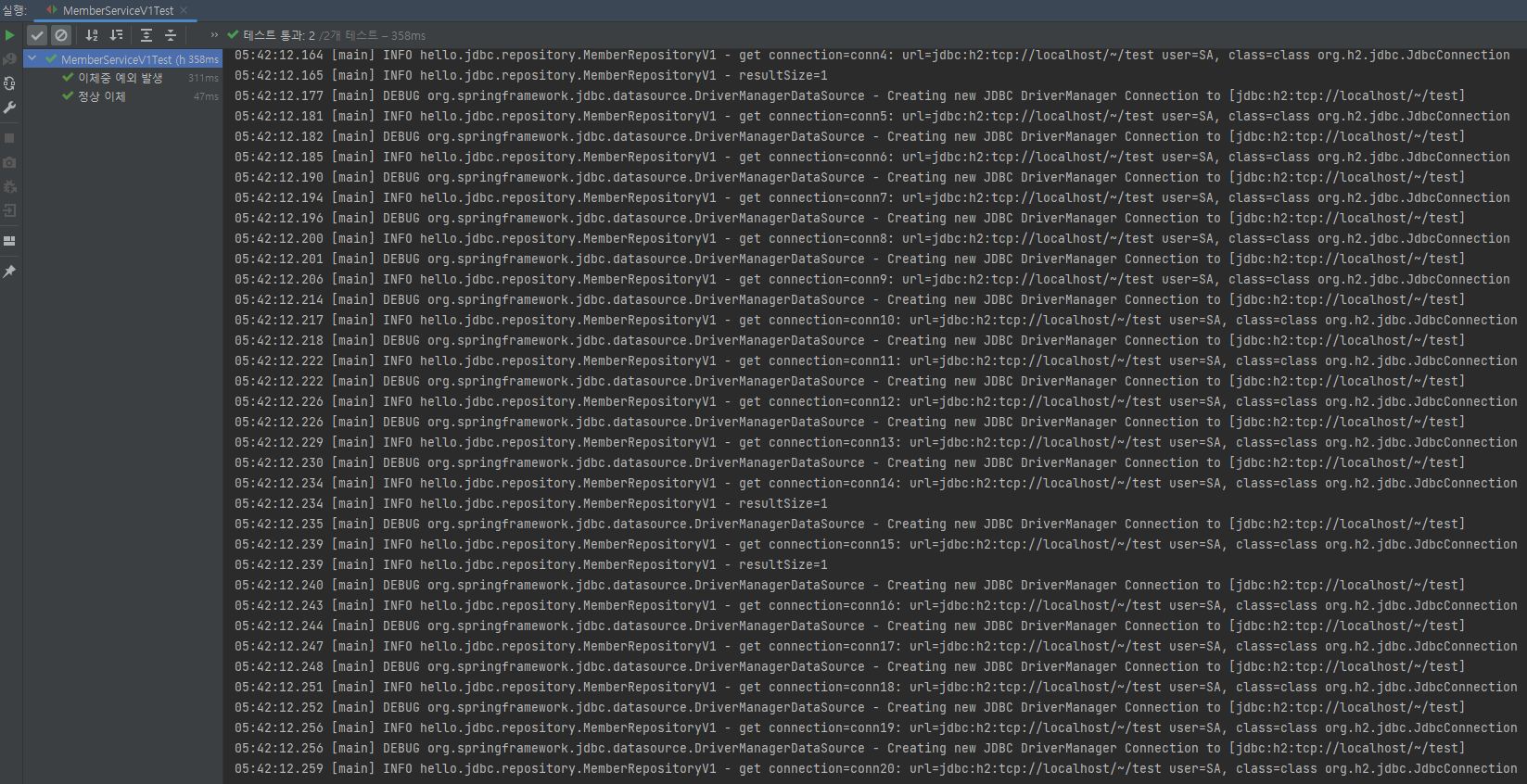 - 2. 커넥션 유지가 필요한 두 메서드는 리포지토리에서 커넥션을 닫으면 안 된다. 커넥션을 전달받은 리포지토리뿐만 아니라 이후에도 커넥션을 계속 이어서 사용하기 때문이다. 이후 서비스 로직이 끝날 때 트랜잭션을 종료하고 닫아야 한다.