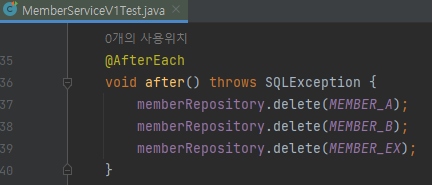 테스트가 끝나면 다음 테스트에 영향을 주지 않기 위해 @AfterEach에서 테스트에 사용한 데이터를 모두 삭제한다.