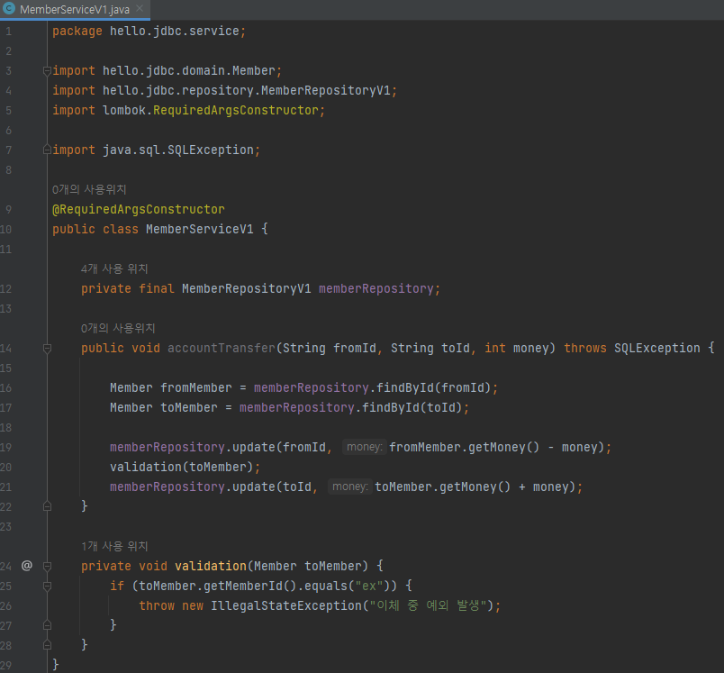 package hello.jdbc.service; import hello.jdbc.domain.Member; import hello.jdbc.repository.MemberRepositoryV1; import lombok.RequiredArgsConstructor; import java.sql.SQLException; @RequiredArgsConstructor public class MemberServiceV1 { private final MemberRepositoryV1 memberRepository; public void accountTransfer(String fromId, String toId, int money) throws SQLException { Member fromMember = memberRepository.findById(fromId); Member toMember = memberRepository.findById(toId); memberRepository.update(fromId, fromMember.getMoney() - money); validation(toMember); memberRepository.update(toId, toMember.getMoney() + money); } private void validation(Member toMember) { if (toMember.getMemberId().equals("ex")) { throw new IllegalStateException("이체 중 예외 발생"); } } }