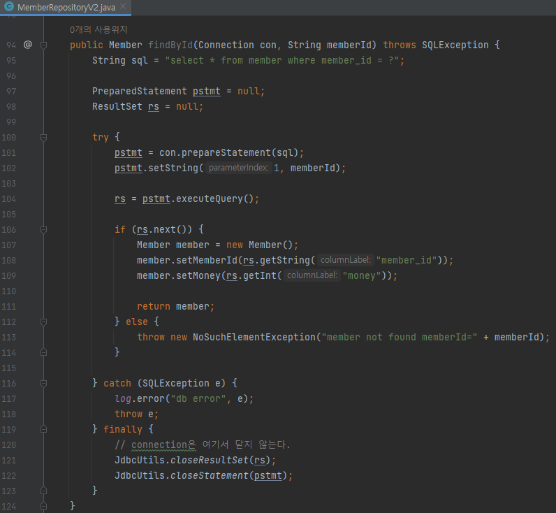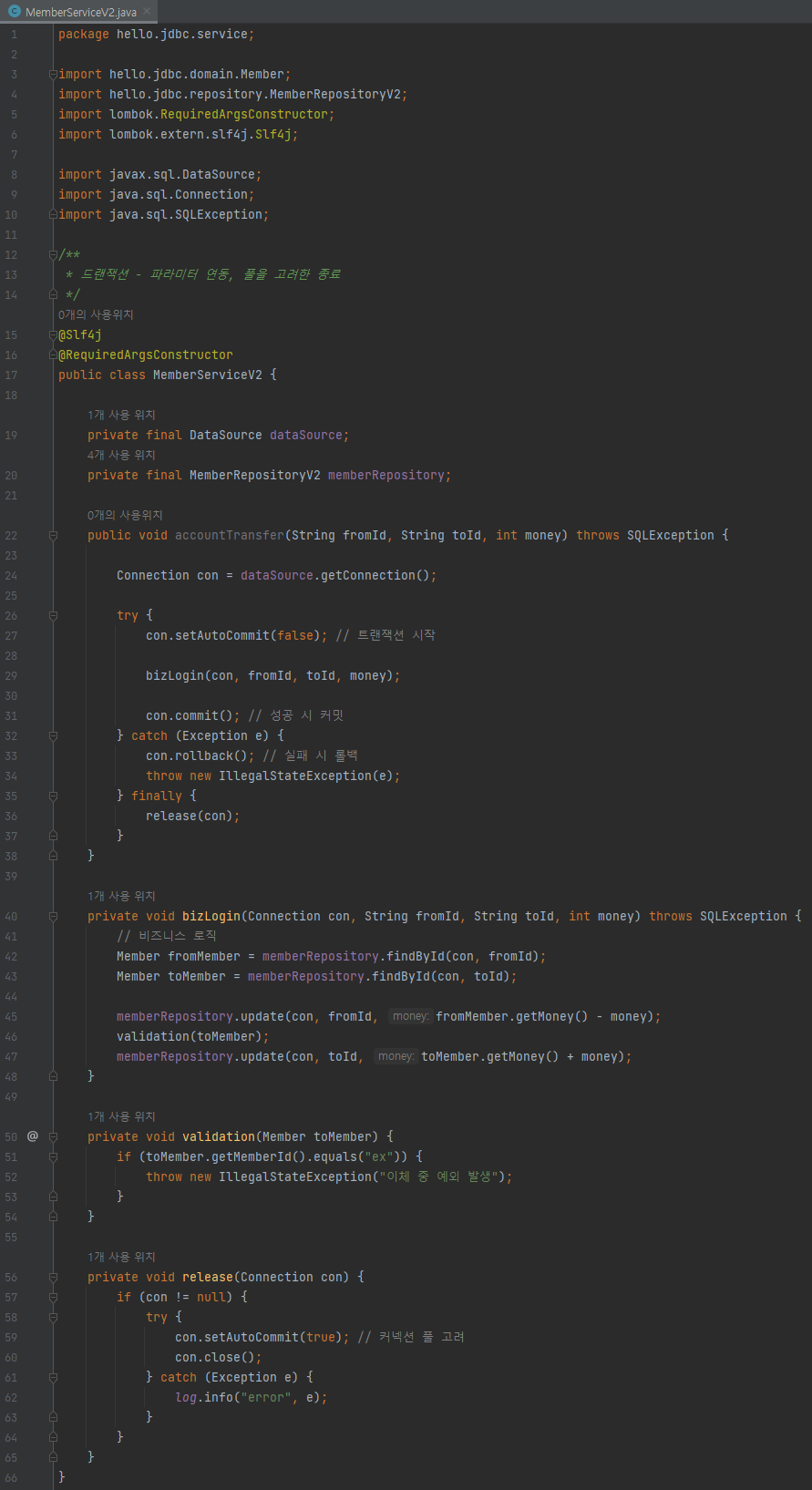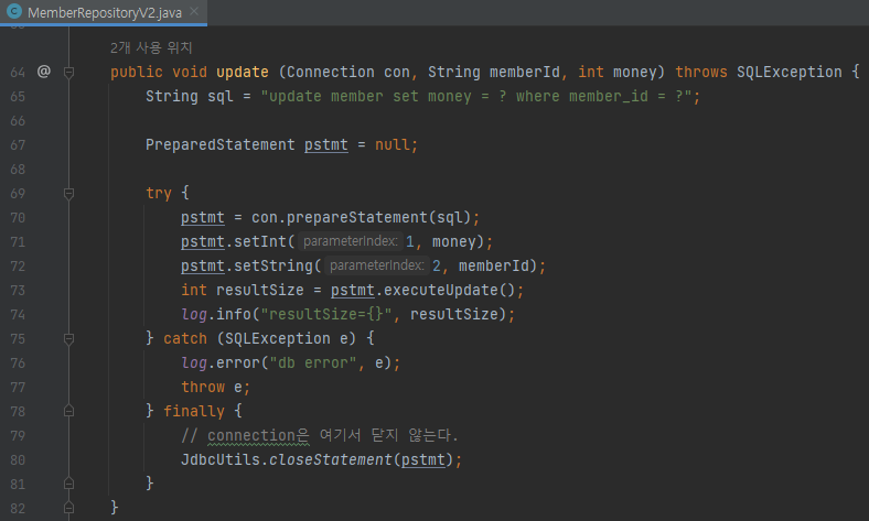 MemberRepositoryV2는 기존 코드와 같고 커넥션 유지가 필요한 다음 두 메서드가 추가되었다. 참고로 다음 두 메서드는 계좌이체 서비스 로직에서 호출하는 메서드이다.