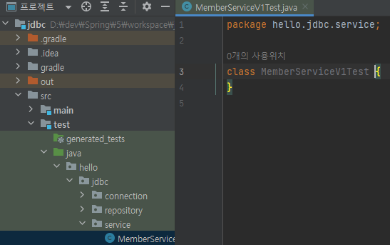 test/java/hello/jdbc/service/MemberServiceV1Test 생성