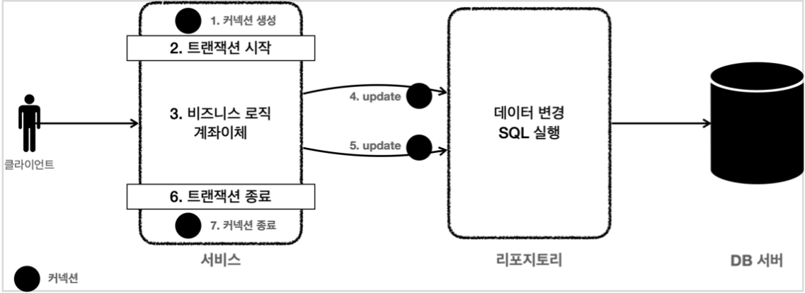실제 애플리케이션에서 DB 트랜잭션을 사용해서 계좌이체 같이 원자성이 중요한 비즈니스 로직을 어떻게 구현하는지 알아보자.