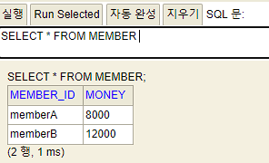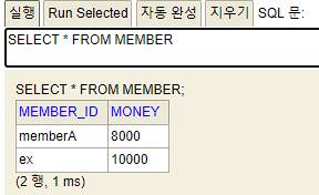 - memberA -> memberEx로 2000원 계좌이체 한다.