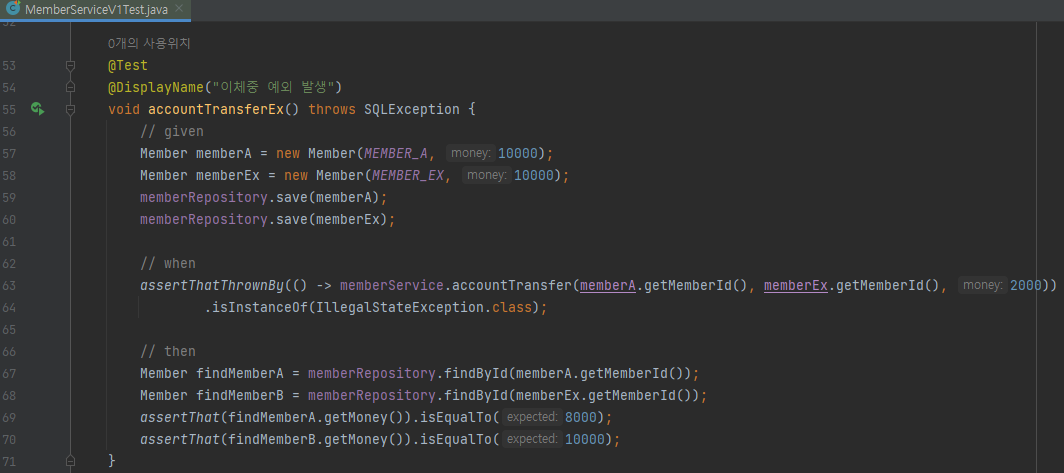 - then : 계좌이체는 실패한다. memberA의 돈만 2000원 줄어든다.