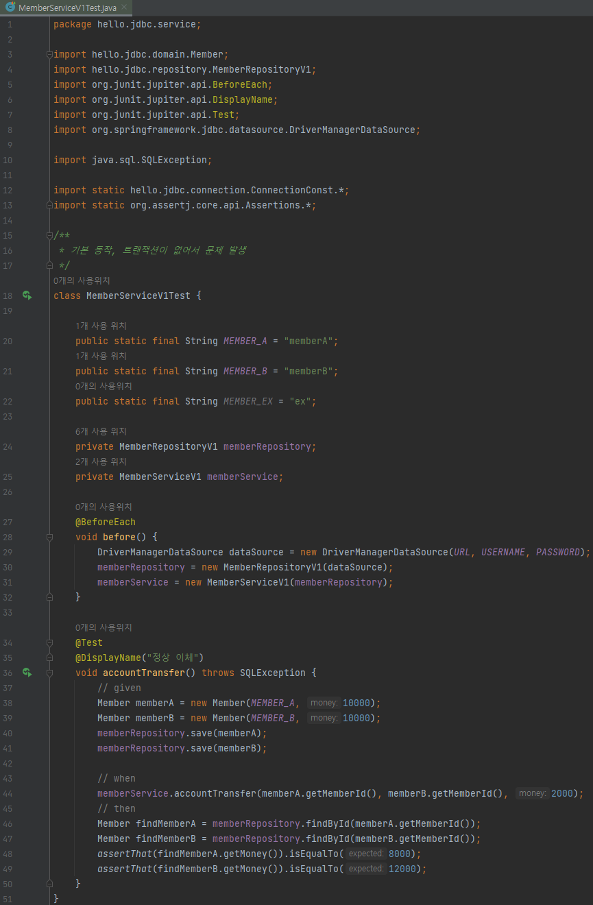 - memberRepository.update(con..) : 비즈니스 로직을 보면 리포지토리를 호출할 때 커넥션을 전달하는 것을 확인할 수 있다.