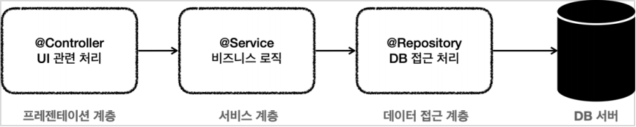 여러 가지 애플리케이션 구조가 있지만, 가장 단순하면서 많이 사용하는 방법은 역할에 따라 3가지 계층으로 나누는 것이다.